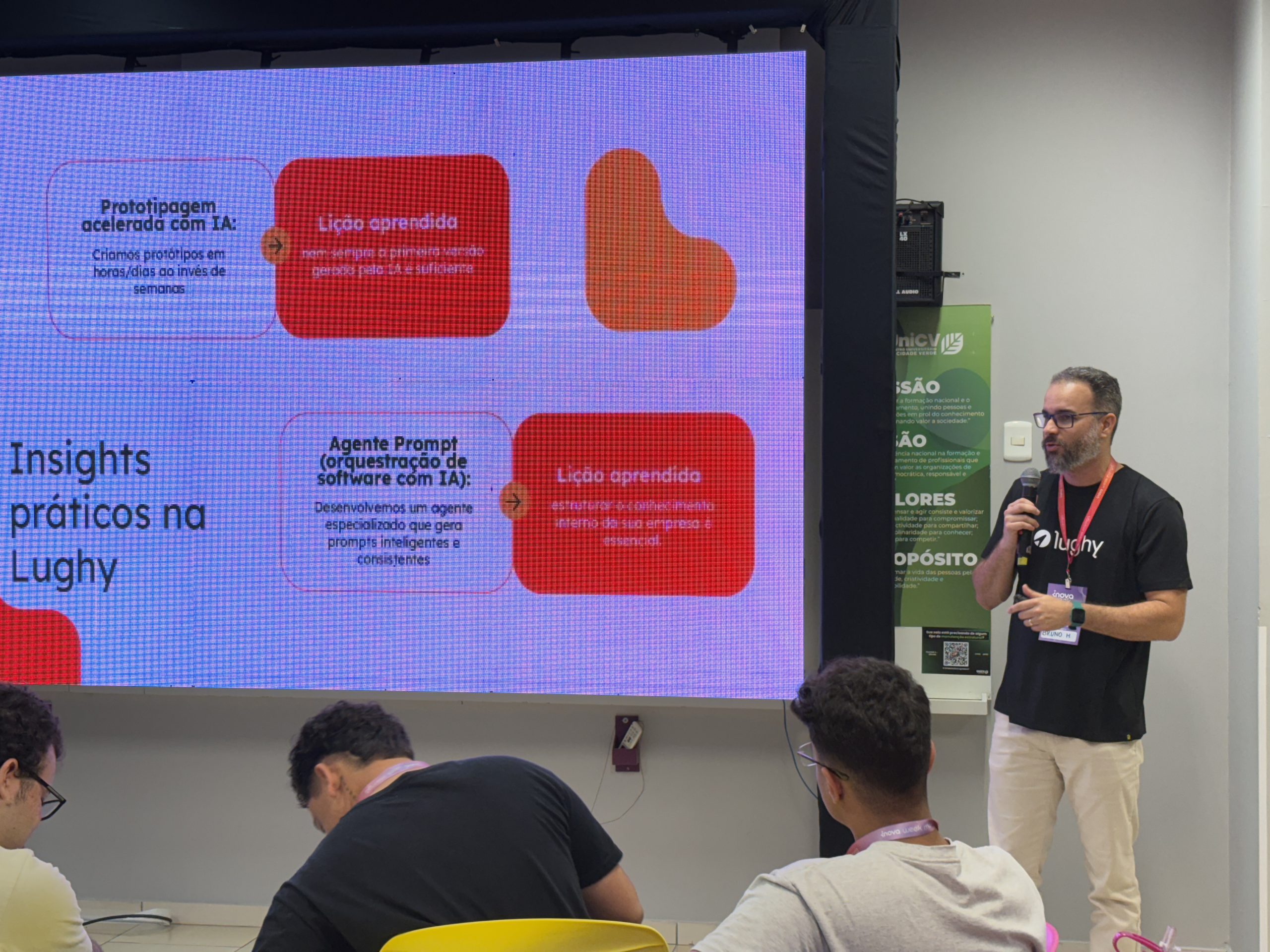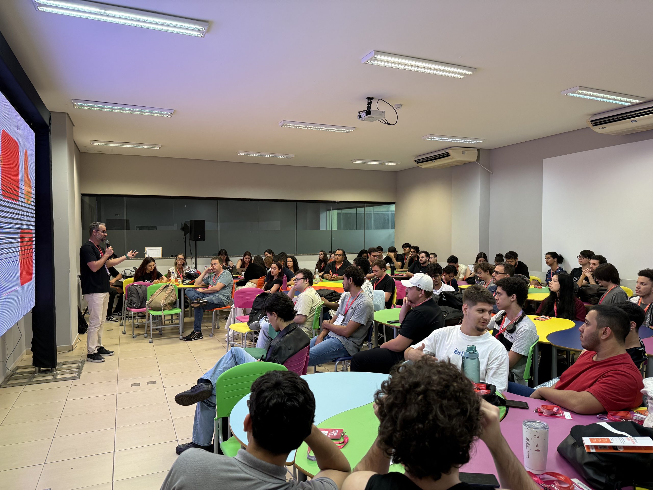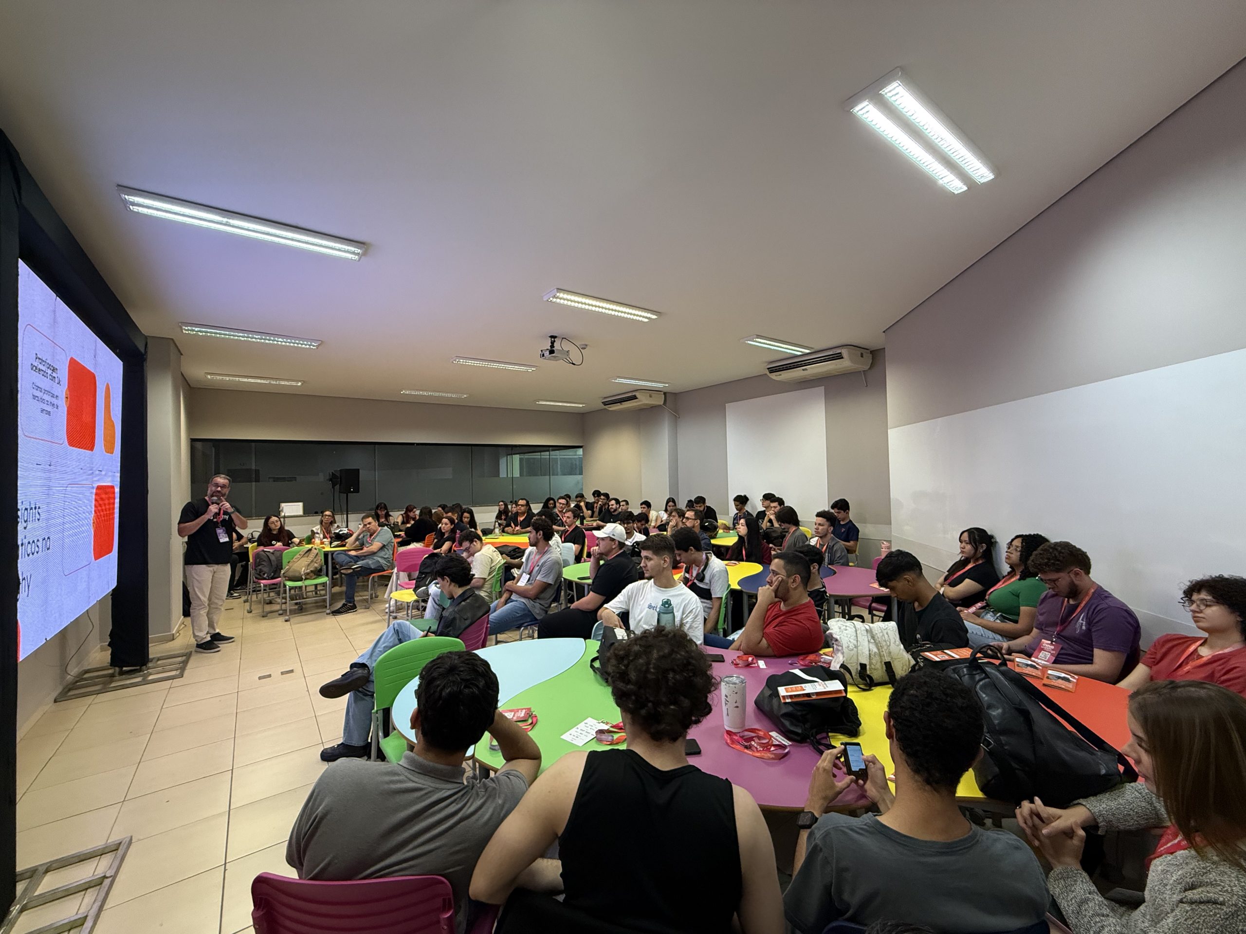 A palestra apresentou tendências e aplicações dos agentes autônomos de Inteligência Artificial, demonstrando como essa tecnologia está revolucionando o desenvolvimento de software e a inovação em projetos diversos.
